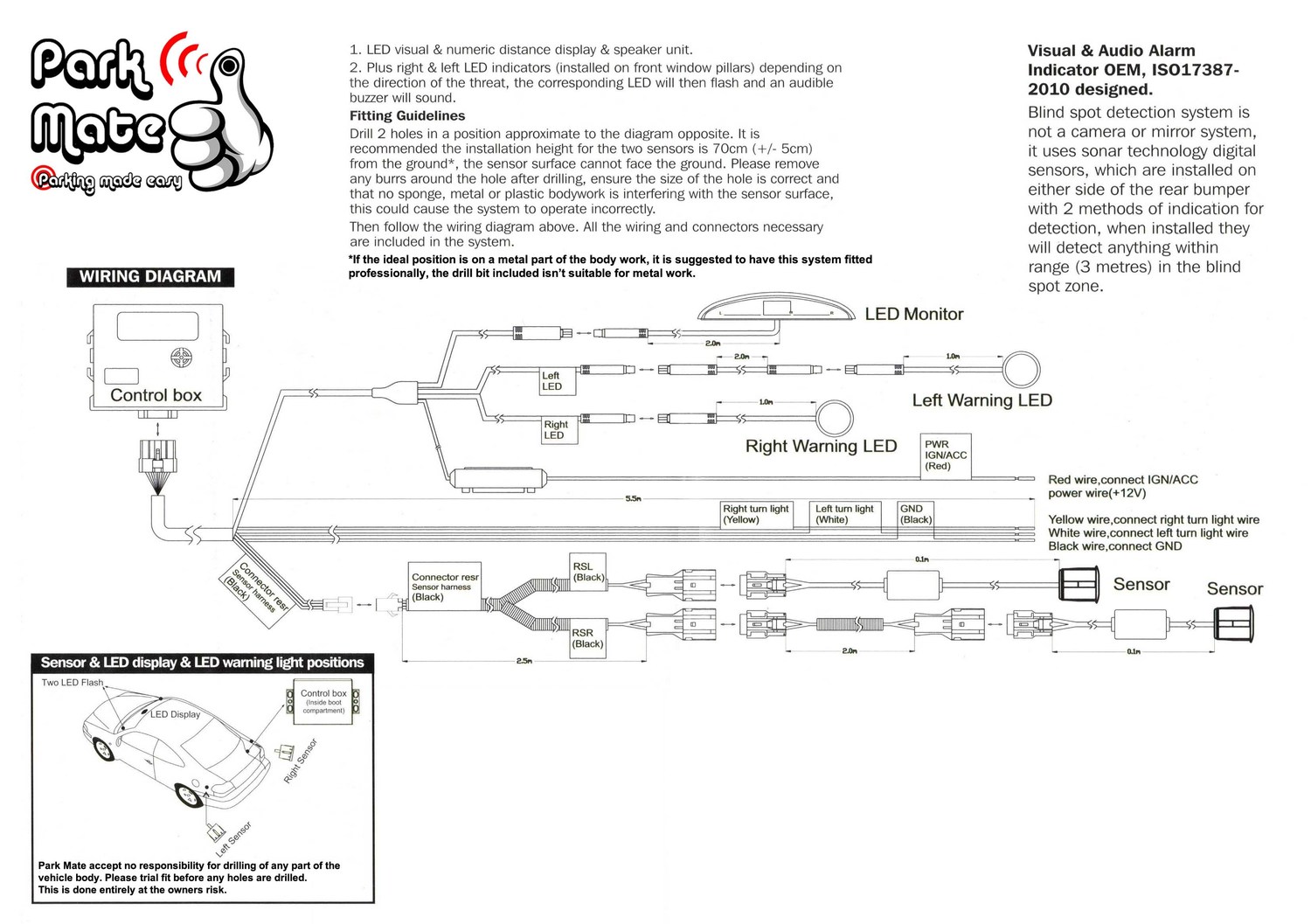 The Park Mate PM50. This easy-fit blind spot lane change detection monitoring assist system kit includes 2 flush mounted sensors – 22mm in diameter (15 standard colours available or choose our custom spraying service to match your existing paintwork – this option can be found in our store) This high quality universal system will cover the widest of cars & give off a professional finish. Included is a dash-mounted LED display, with a buzzer which gives audible bleeps. Left & right LED indicators (installed on front window pillars) also flash to let you know of a vehicle beside you when indicating. Free bumper drill bit included. Fitting guide can also be found at the bottom of the Park-Mate website.