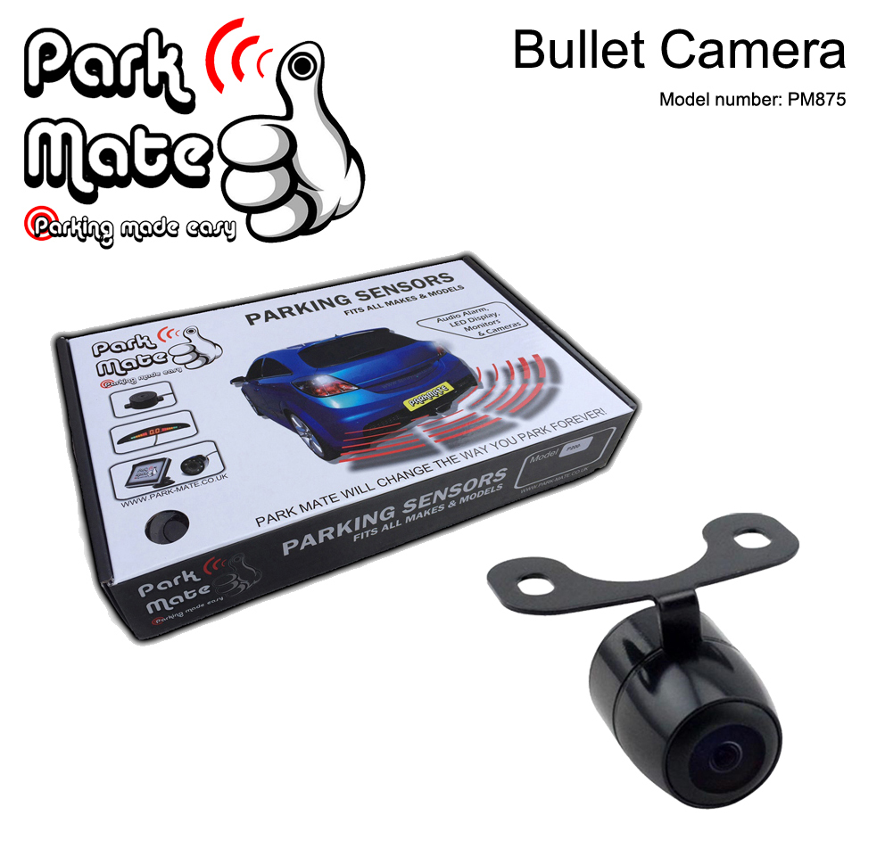 The Park Mate PM875 is a small bullet colour camera, which can be mounted to a rear bumper (normally mounted on top of the number plate recess) or on the tailgate (normally mounted on top of the number plate recess) Or on the front bumper. The base plate can be fixed to the bodywork with 2 small screws (included) Comes with a power lead to attach to the reverse light, & a 6 metre video cable to connect the video feed to the monitor at the front (this lead also has its own power lead to give power to the monitor from the reverse light)