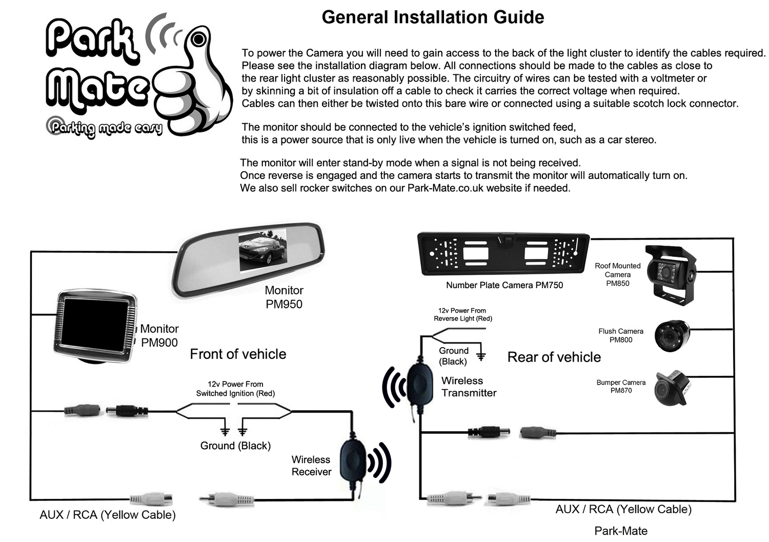 The Park Mate PM690 3.5'' TFT LCD colour monitor is a compact dash-mounted screen (includes self-adhesive pad) Comes with its own power cable. The reversing camera is a small adjustable box colour camera, which is mounted to the rear of the caravan. The base plate can be fixed to the bodywork with 2 small screws (included) A wireless module is then connected to the reversing feed of the caravan, which the camera plugs into. Another wireless module is then connected to a live feed on the ignition or radio (or connect to a rocker switch, found on the Park-Mate website) where the monitor plugs into. When the caravan is engaged into reverse, this will power the wireless module’s, giving approx 80m wireless range. 2x snap connectors supplied - simply insert the wire inside the connector, connect to the positive cable on the reverse light, squeeze the contact down flush with the connector and snap the hinged cover in place. It's that easy! Fitting guide can also be found at the bottom of the Park-Mate website.